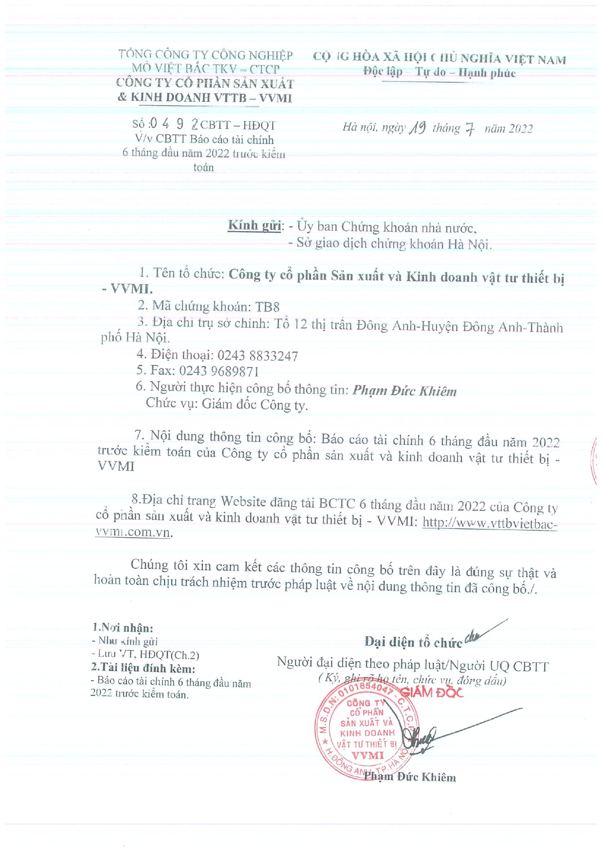 CBTT ( Ông VƯƠNG KHẮC TUẤN- TP KHVTTT được bổ nhiệm giữ chức vụ Phó GIám Đốc Cty CP SX và KD VTTB - VVMI kể từ ngày 16/8/2022 )