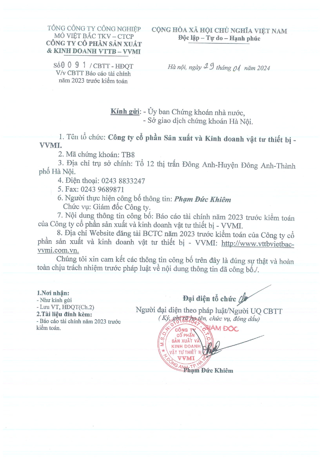 CBTT Báo cáo tài chính năm 2023 trước kiểm toán