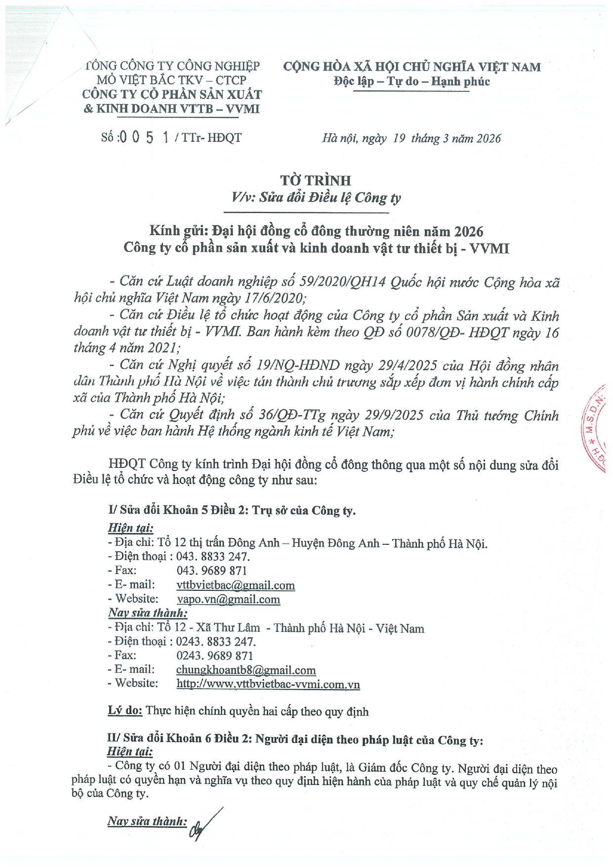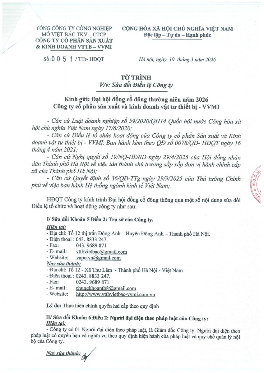 Tờ trình V/v Sửa đổi một số nội dung điều lệ tổ chức và hoạt động của Công ty