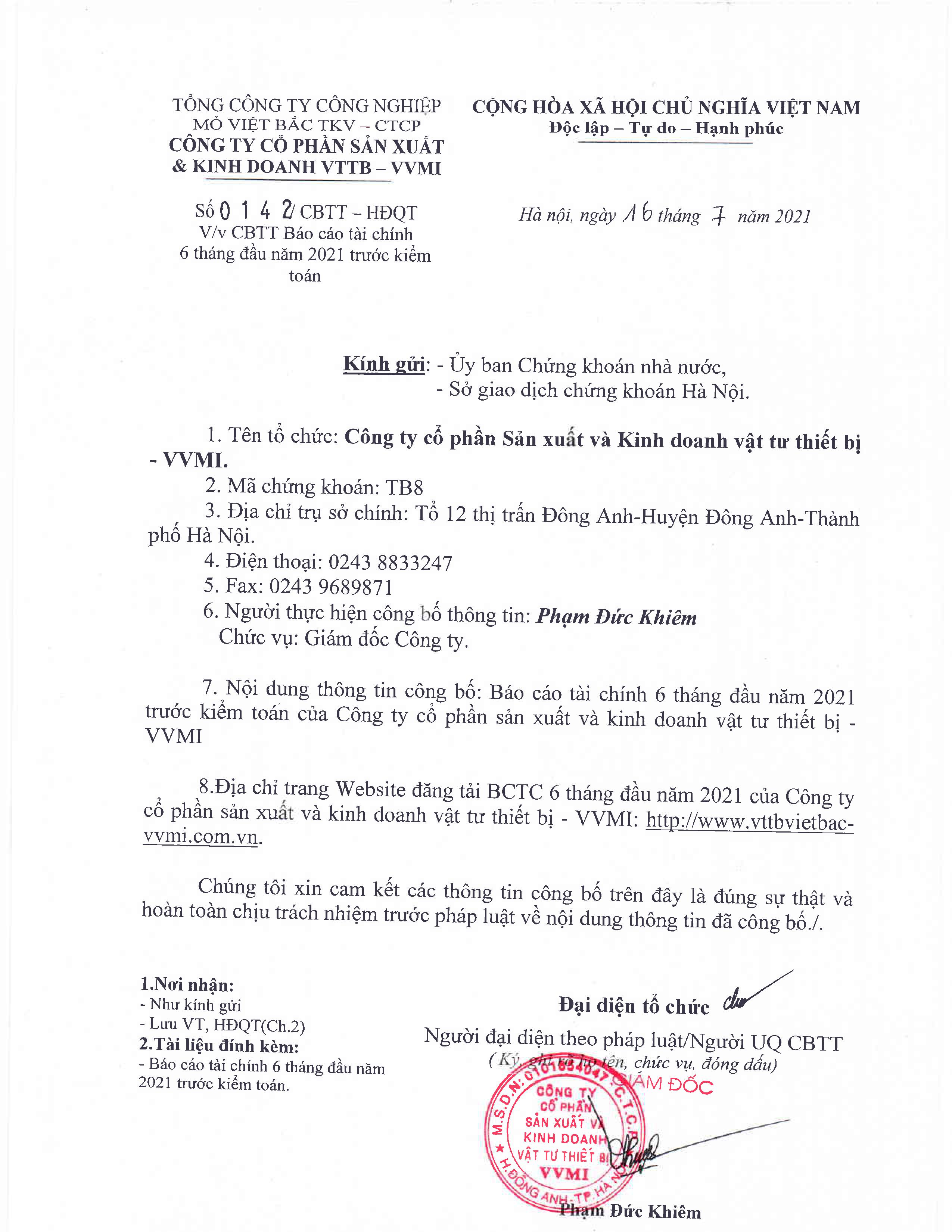 Công bố thông tin ( Báo cáo tài chính 6 tháng đầu năm 2021 trước kiểm toán )