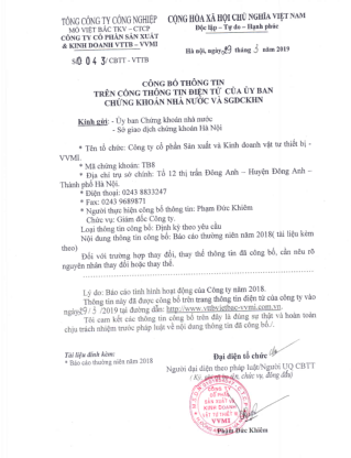 Công bố thông tin ( Báo cáo thường niên năm 2018 + Báo cáo tình hình hoạt động của Cty năm 2018 )