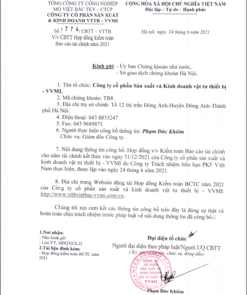 CBTT ( Ông VƯƠNG KHẮC TUẤN- TP KHVTTT được bổ nhiệm giữ chức vụ Phó GIám Đốc Cty CP SX và KD VTTB - VVMI kể từ ngày 16/8/2022 )