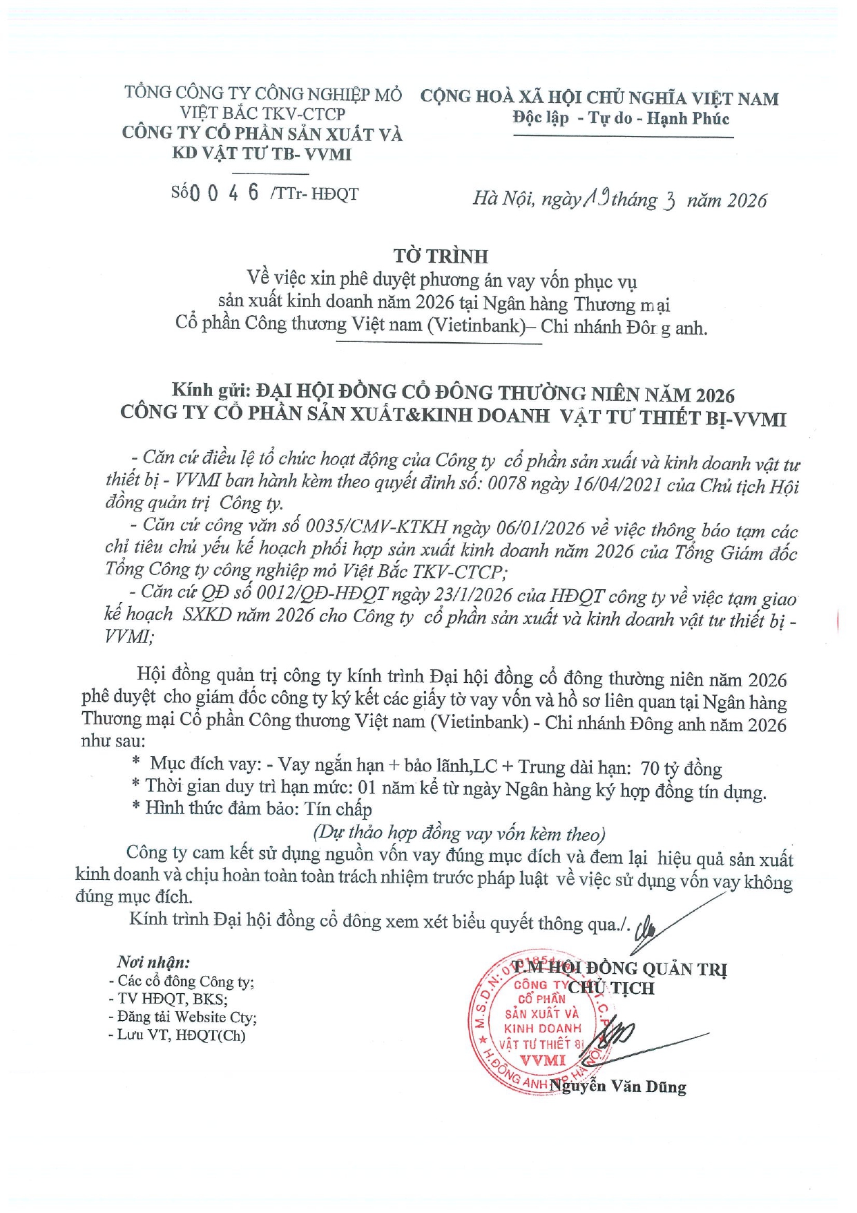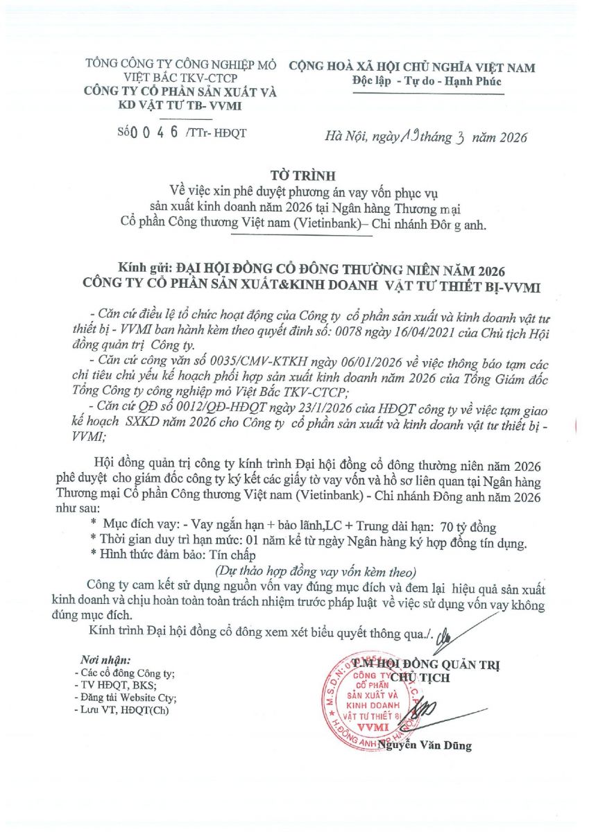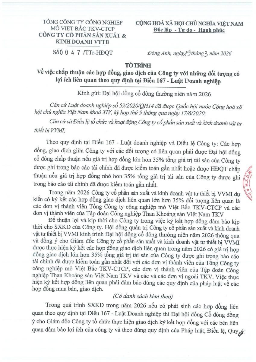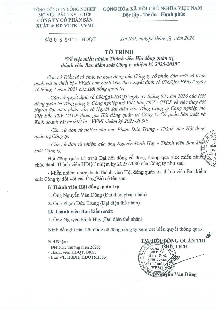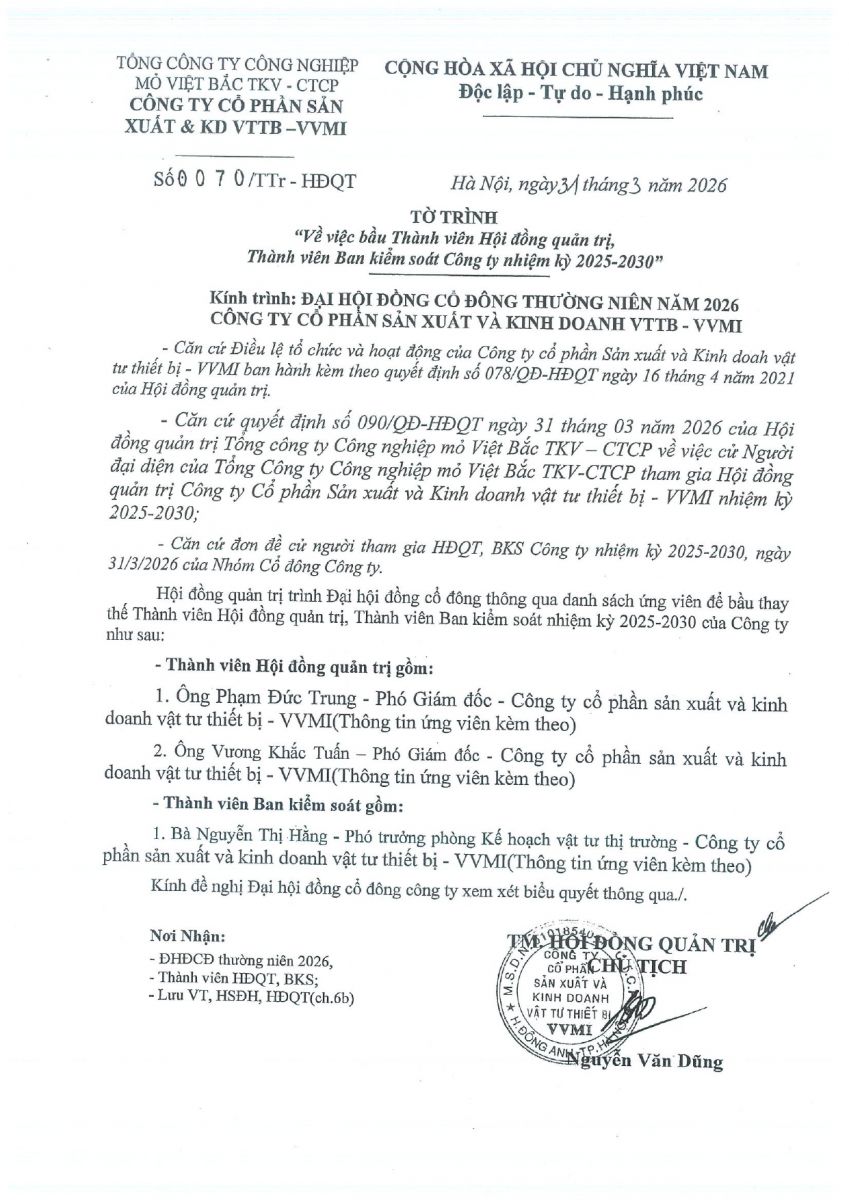 Tờ trình V/v Thông qua nội dung"Quy chế nội bộ về quản trị Công ty"