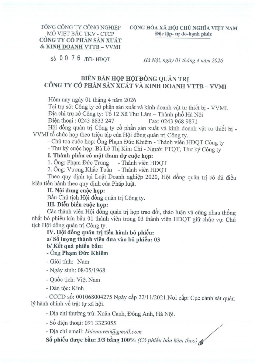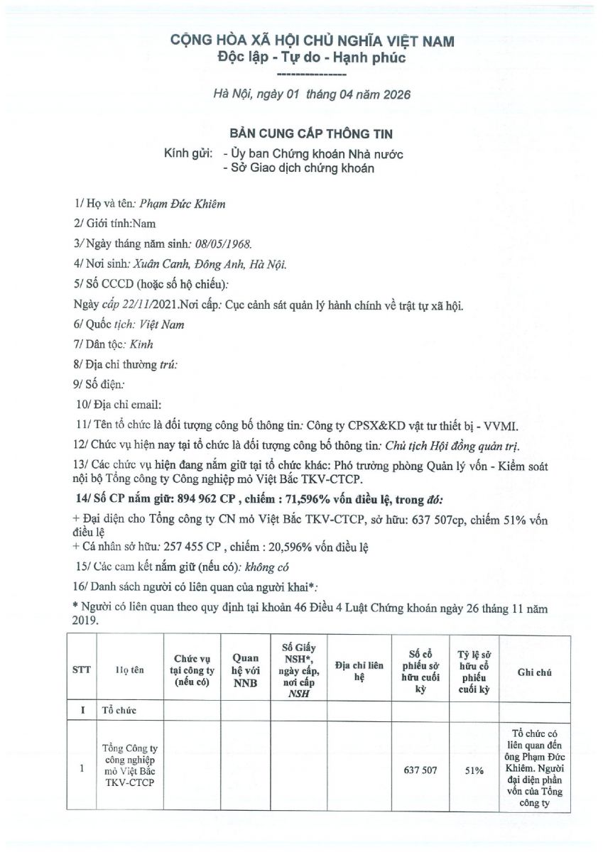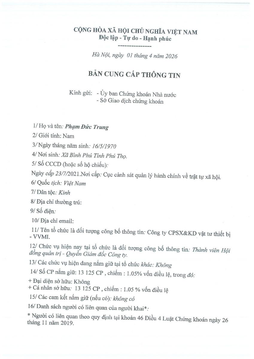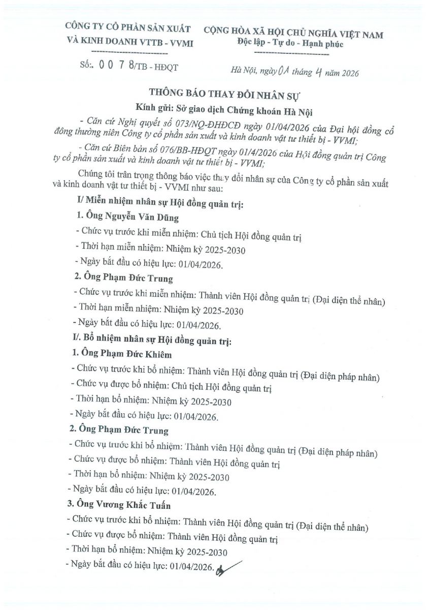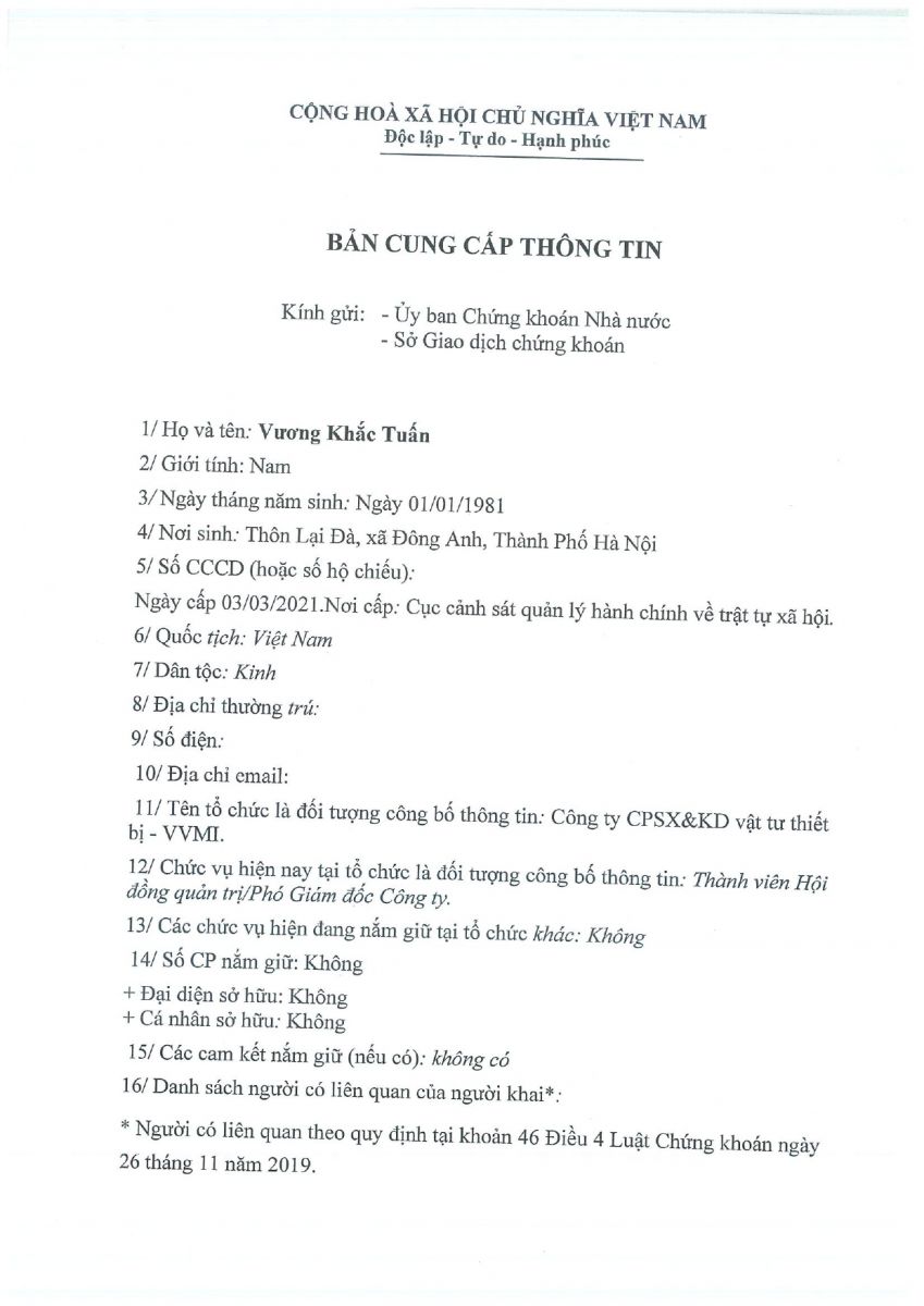 CBTT ( Ông VƯƠNG KHẮC TUẤN- TP KHVTTT được bổ nhiệm giữ chức vụ Phó GIám Đốc Cty CP SX và KD VTTB - VVMI kể từ ngày 16/8/2022 )