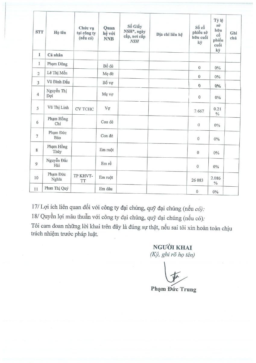 CBTT ( Thông báo giao dịch cổ phiếu/ chứng chỉ quỹ/ chứng quyền có đảm bảo của người nội bộ và người có liên quan của người nội bộ )