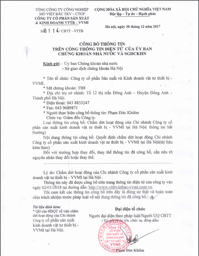 QĐ chấm dứt hoạt động của Chi nhánh Cty CP SX&KD VTTB-VVMI