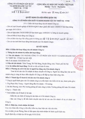 QĐ chấm dứt hoạt động của Chi nhánh Cty CP SX&KD VTTB-VVMI