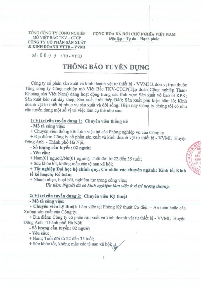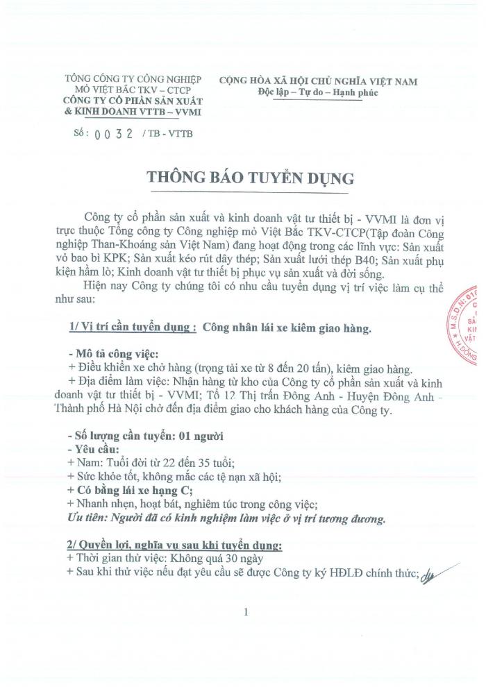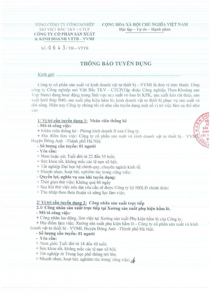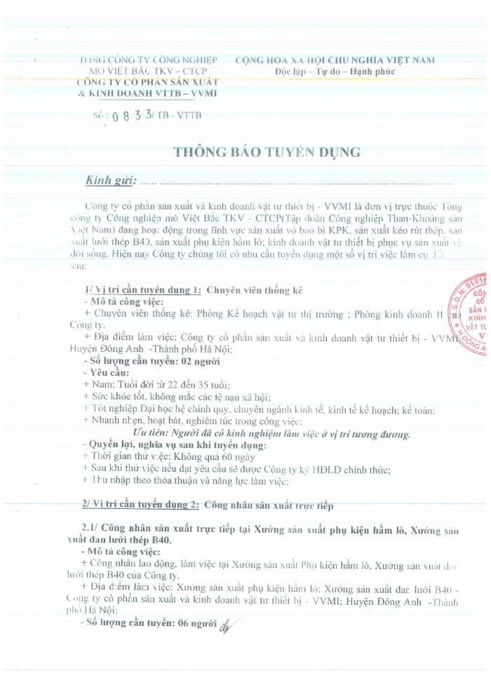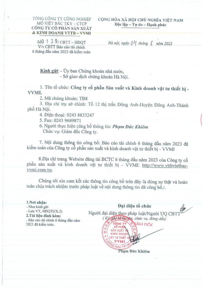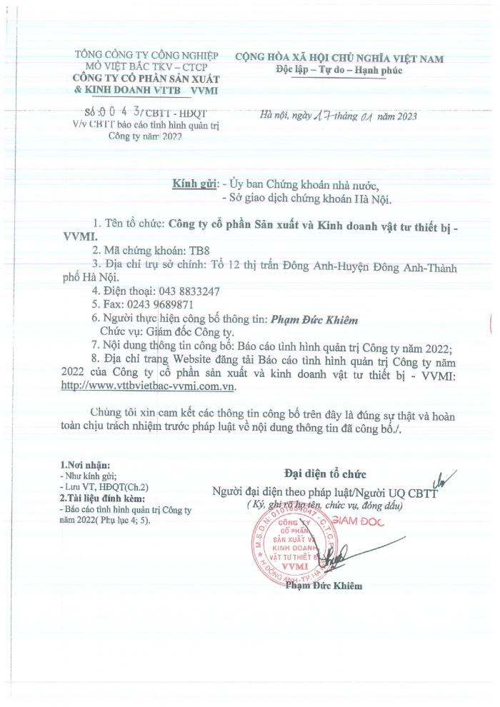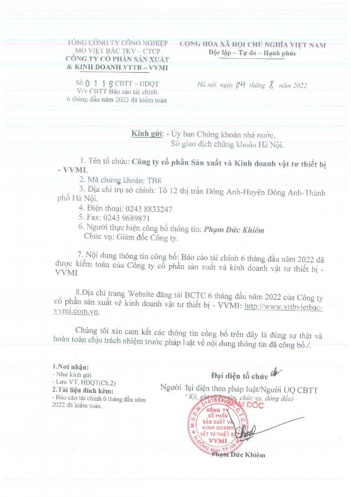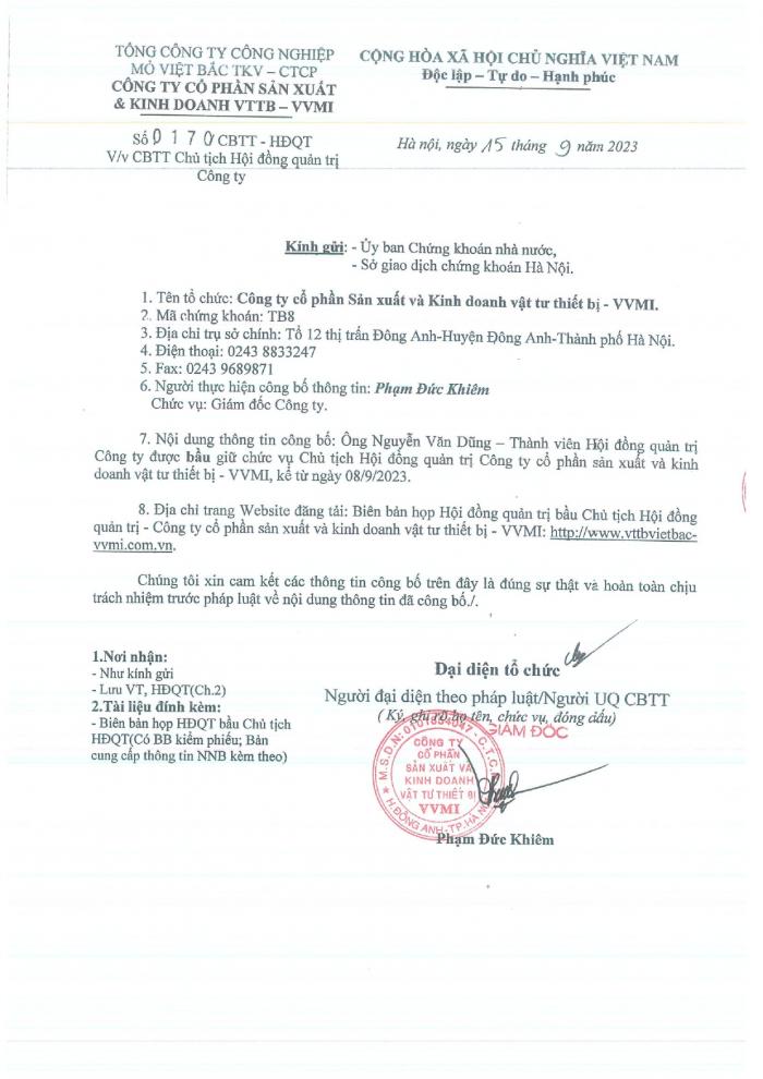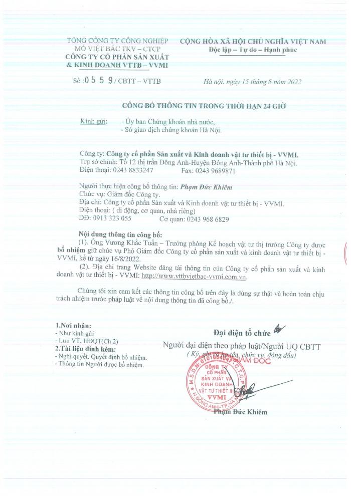 CBTT ( Ông VƯƠNG KHẮC TUẤN- TP KHVTTT được bổ nhiệm giữ chức vụ Phó GIám Đốc Cty CP SX và KD VTTB - VVMI kể từ ngày 16/8/2022 )