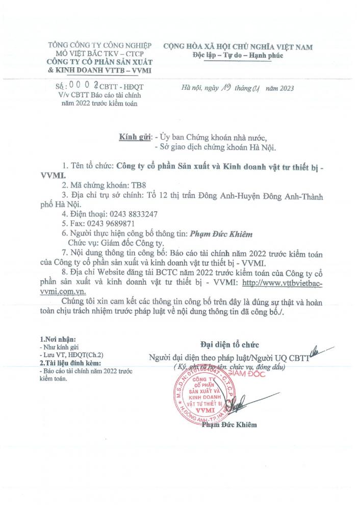 CBTT Báo cáo tài chính năm 2022 trước kiểm toán