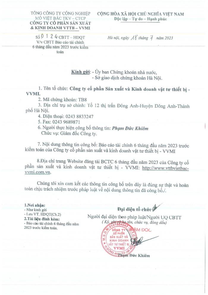 CBTT Báo cáo tài chính 6 tháng đầu năm 2023 trước kiểm toán