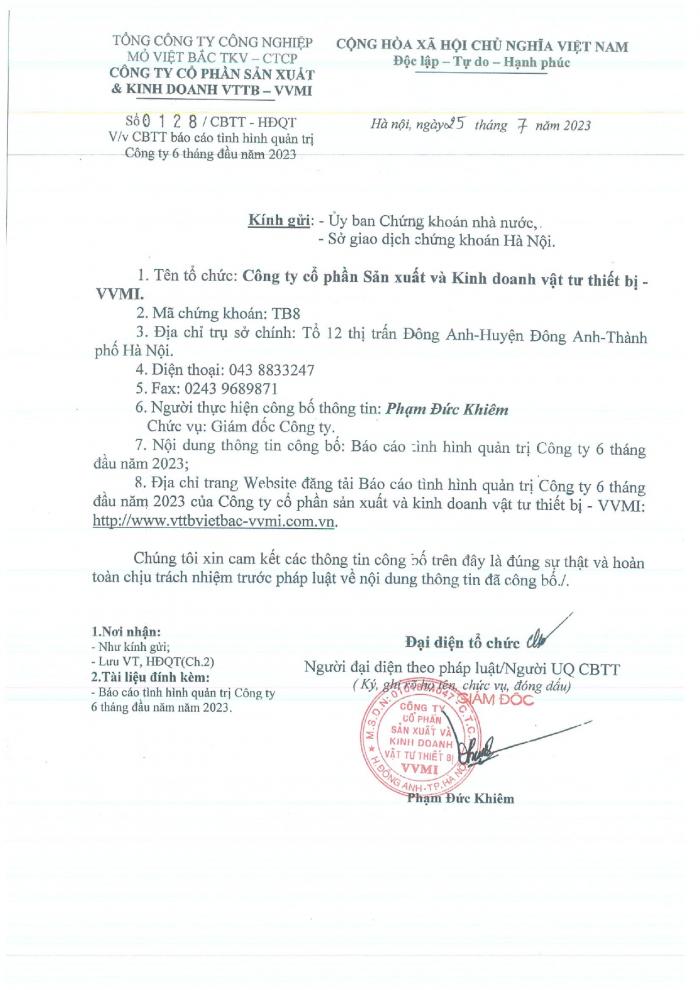 CBTT báo báo tình hình quản trị 6 tháng đầu năm 2023