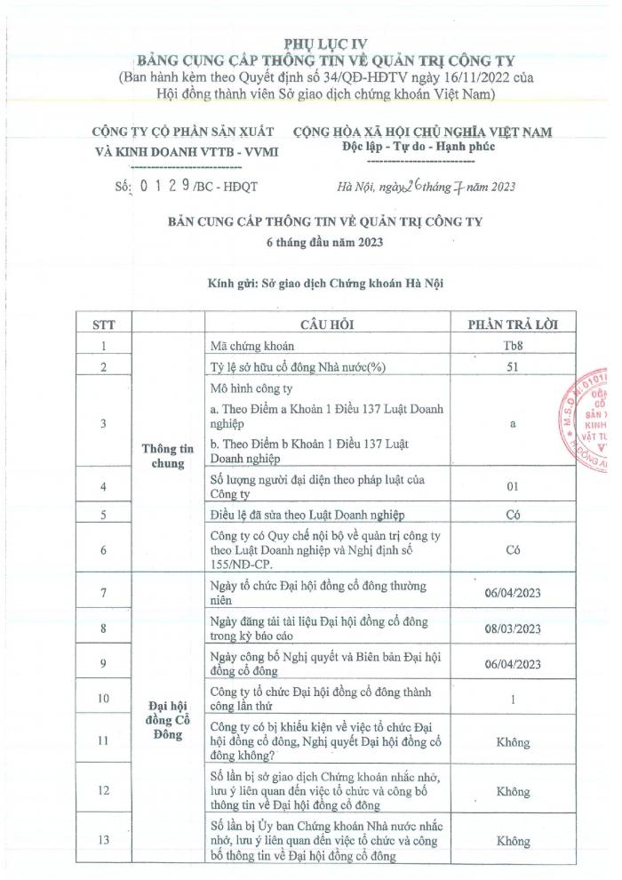 CBTT (Phụ lục IV bảng cung cấp thông tin về quản trị công ty 6 tháng đầu năm 2023)