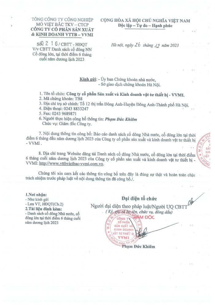 CBTT Danh sách cổ đông NN Cổ đông lớn tại thời điểm 6 Tháng cuối năm dương lịch 2023