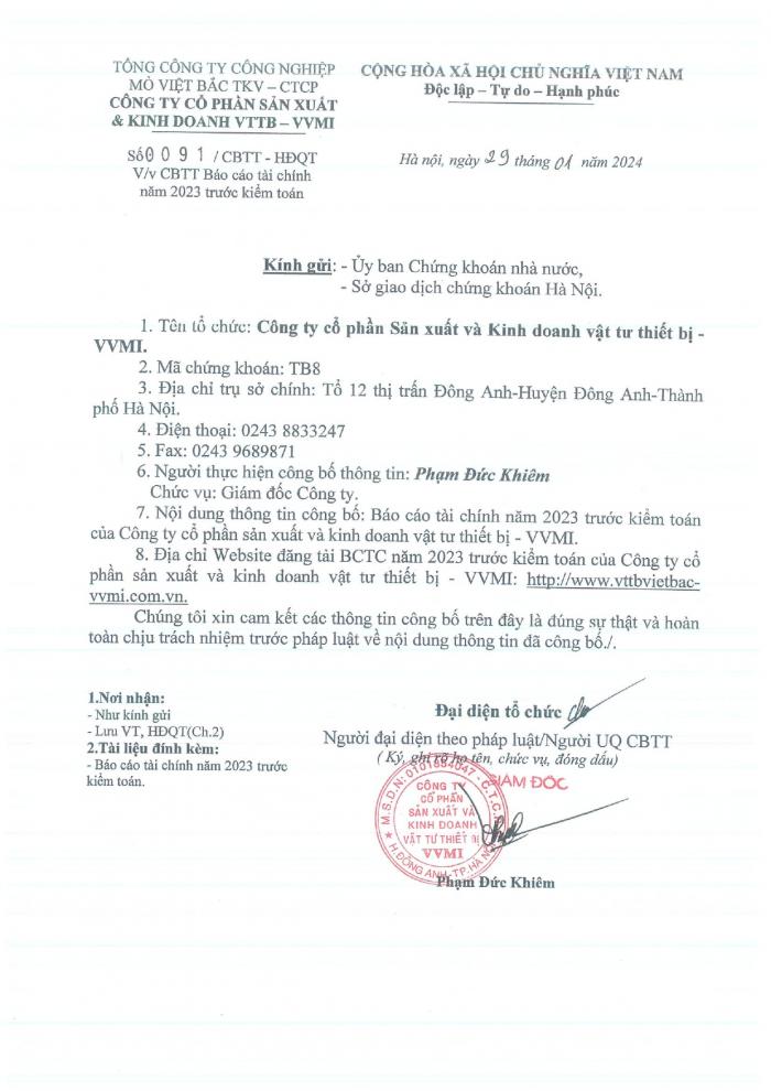 CBTT Báo cáo tài chính năm 2023 trước kiểm toán
