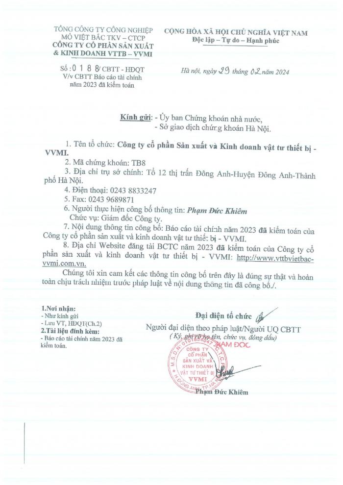 CBTT trong thời hạn 24 giờ ( bổ nhiệm lại KTT cty cp sx và kd VTTB - VVMI kể từ ngày 01/01/2024)