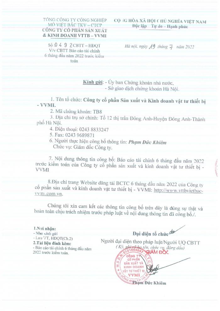 CBTT ( báo cáo tài chính 6 tháng đầu năm 2022 trước kiểm toán )